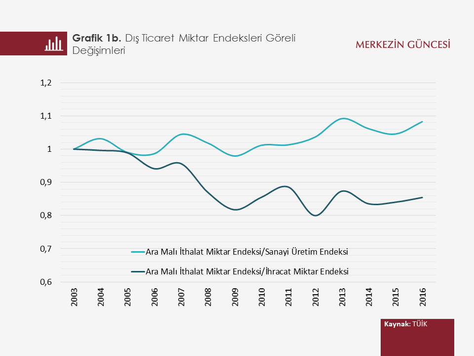 Türkiye ekonomisi zaman içerisinde yatırım/sermaye malı, ara malı ve hammadde kullanımında ithalat-yoğun bir üretim ve ihracat yapısına doğru kaydı. Temmuz 2017 itibarıyla, ara malı ithalatının toplam ithalat içindeki payı yüzde 74 seviyelerindeyken, yatırım malı ithalatı için bu oran yüzde 14 düzeyinde[3]. Girdi ithalatında, toplam ithalat içindeki yüzde 15’lik payıyla kimyasal madde ve ürünleri, yüzde 14 ile enerji ve yüzde 11’lik paylarıyla makine-teçhizat ve ana metaller takip ediyor. Ara malı ithalat miktar endeksinin Türkiye’de tarihsel olarak belirgin bir artış eğilimi içinde olduğu da gözlenmekte (Grafik 1.a). Diğer taraftan, üretimin genel eğilimiyle karşılaştırıldığında girdi ithalatındaki eğilimin genellikle ihracatın altında, sanayi üretiminin ise biraz üzerinde seyrettiği söylenebilir (Grafik 1.b). Ara malı ithalat endeksinin sanayi üretim endeksi ile göreli seyri incelendiğinde, dalgalı hareket ettiği ve ekonominin durağanlaştığı dönemlerde gerilediği görülüyor [Saygılı ve diğ. (2010)].
