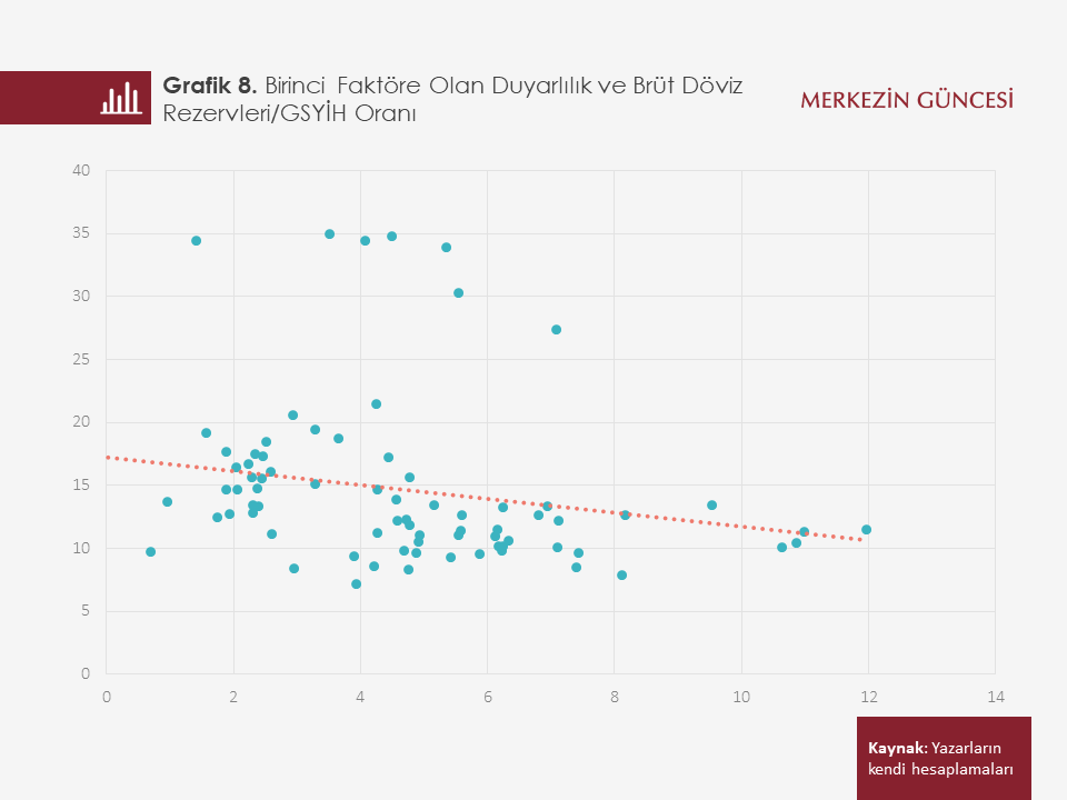 Küresel risk faktörü olarak tanımlanan temel bileşene olan duyarlılığın ülke ve zaman boyutlarında farklılaşması, bu duyarlılığı etkileyebilecek etmenlerin neler olabileceği sorusunu beraberinde getiriyor. Bu kapsamda panel regresyon modeli kullanılarak küresel risk faktörüne olan duyarlılık, ampirik literatürde CDS primlerindeki hareketleri açıklamada sıklıkla kullanılan makroekonomik değişkenlerle açıklandı. Veri seti büyüme, enflasyon, cari denge, dış ticaret hacmi, bütçe dengesi, kamu borçluluğu, net uluslararası yatırım pozisyonu ve döviz rezervleri gibi değişkenlere dair bilgiler içeriyor. Gerçekleştirilen sabit-etkiler modeli sonucunda, kamu borçluluğu ve döviz rezervlerinin küresel risk faktörüne olan duyarlılığı istatistiksel olarak anlamlı bir şekilde etkilediği bulundu. Bir diğer deyişle, düşük kamu borcu ve yüksek döviz rezervleri bulunan GOÜ’lerin kredi risk primlerinin, küresel finansal koşullar ve risk iştahındaki değişimlere daha az duyarlı olduğu ortaya konuldu (Grafik 7 ve 8).