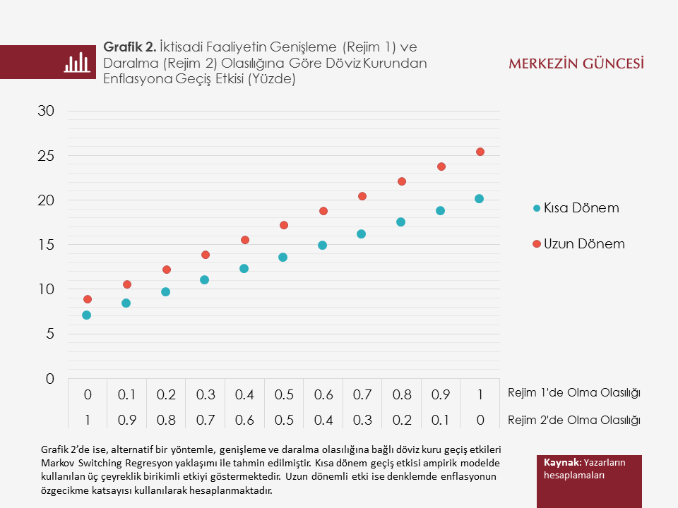 Grafik 1’de görüldüğü gibi, ekonominin potansiyel düzeyinde seyrettiği (çıktı açığının sıfıra yakın olduğu) durumda döviz kuru geçişkenliği yüzde 15 civarında gerçekleşiyor; öte yandan aynı grafik iktisadi faaliyetteki konjonktürel dalgalanmaların bu esnekliği farklılaştırabildiğini de gösteriyor. Aşırı ısınma dönemlerinde döviz kuru geçişkenliği yüzde 25’lere ulaşırken soğuma fazlarında yüzde 10’un altına inebiliyor. Alternatif bir yöntemle, genişleme ve daralma dönemlerine atfedilen olasılıklar üzerinden bir tahmin yaptığımızda da benzer bulgulara ulaşıyoruz (Grafik 2).