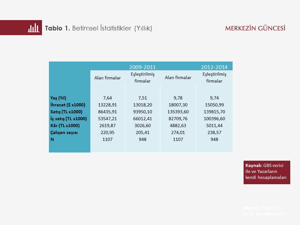 Eğilim skoru eşleştirme yönteminin önemi betimsel istatistiklerde kolaylıkla görülebilmekte. 2012 yılında reeskont kredisi almış firmaların 2009-2011 döneminde diğer ihracatçı firmalardan daha fazla kişi çalıştırdığı, daha fazla toplam satış ve ihracat yaptığı görülüyor. Reeskont kredisi alan firmalardaki ortalama çalışan sayısı 221 iken diğer ihracatçı firmalar arasındaki ortalama çalışan sayısı 47. Benzer şekilde reeskont kredisi alan firmaların ortalama yıllık ihracatı 13,2 milyon ABD doları iken diğer ihracatçı firmalar arasındaki ortalama 1,4 milyon ABD doları. Eğilim skoru eşleştirme yöntemi ile tespit edilen reeskont kredisi kullanmamış firmaların 2012 öncesi karakteristikleri ise krediyi kullanmış olan firmalara benzemekte. Eşleştirilmiş ancak reeskont kredisi almamış firmaların ortalama çalışan sayısı 205, ortalama ihracatları ise 13 milyon ABD doları. İstatistiksel testler eşleştirilmiş firmalar ile reeskont kredisi almış firmaların yöntemde kullanılan tüm karakteristiklerde dengeli olduğunu gösteriyor. Reeskont kredisinin etkileri değerlendirilirken ve bu konuda politika geliştirilirken reeskont kredisinden büyük ölçekli ihracatçı firmaların faydalandığı göz önünde bulundurulmalı.