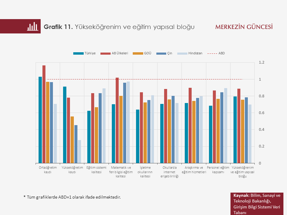 Beşeri sermaye ile verimlilik arasındaki ilişki artık bilinen bir gerçek. DEF 2016-2017 Küresel Rekabetçilik Raporu’na göre Türkiye eğitim yapısal bloğunda, AB ve ABD gibi gelişmiş ülke ekonomilerinin gerisinde iken gelişmekte olan ülkelere göre daha iyi durumda. Ancak alt detaylara bakıldığında, eğitim kalitesi konusunda Türkiye diğer gelişmekte olan ülke ekonomilerinin gerisinde kalıyor (Grafik 11).