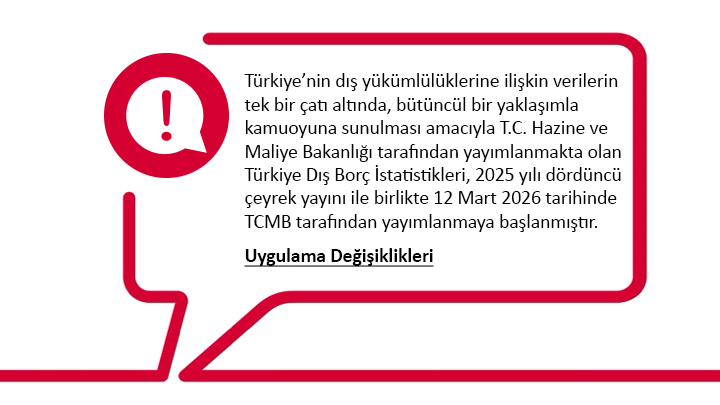 Türkiye Dış Borç İstatistikleri'ne ilişkin detaylı bilgilere, Merkezin Güncesi’nde yayımlanan “Dış Borç ve Ödemeler Dengesi İstatistiklerinin Derlenmesi ve Yayımlanmasında Yeni Dönem” başlıklı blog yazısından erişilebilmektedir.